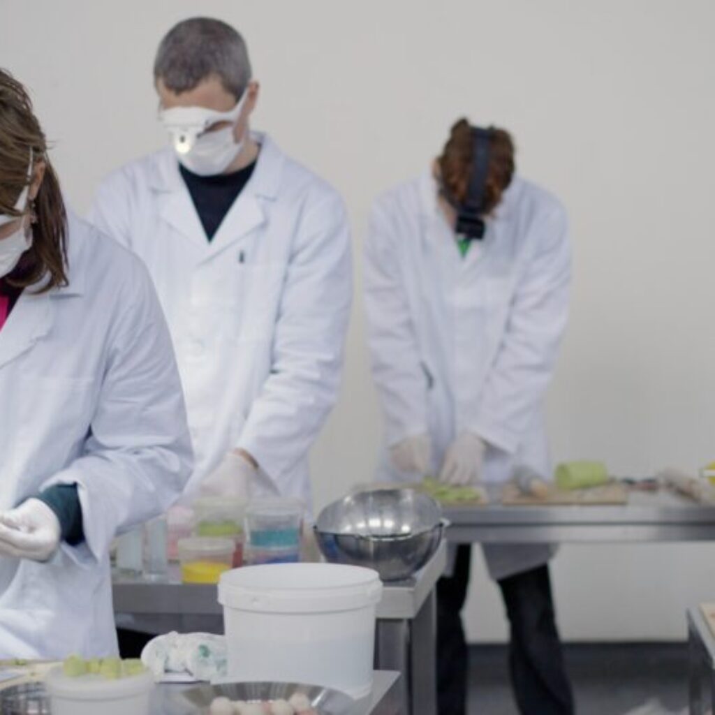 Within this setting, enigmatic ceramic objects resembling internal organs are produced, examined, and meticulously drawn. These acts function as a form of documentation, echoing historical methods of anatomical study and observation, and unfold within what appears to be a pedagogical environment. Through repetition, the gestures performed by the participants become ritualized, contributing to an atmosphere that is both quietly mysterious and resolutely ordinary.