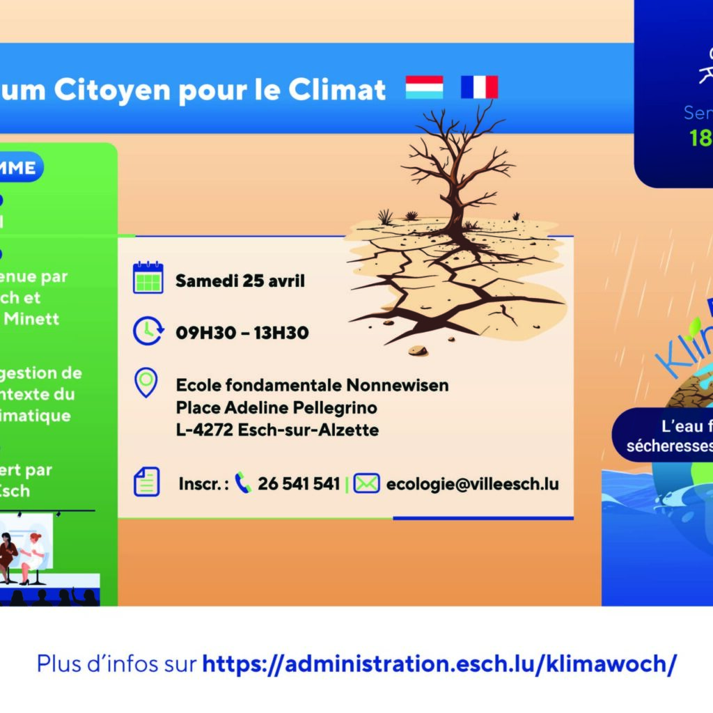 C'est pourquoi la Ville d'Esch – avec Transition Minett – vous invitent à participer au 3e Forum Citoyen pour le Climat avec pour thématique l'eau face aux extrêmes : sécheresses, inondations et résilience.
