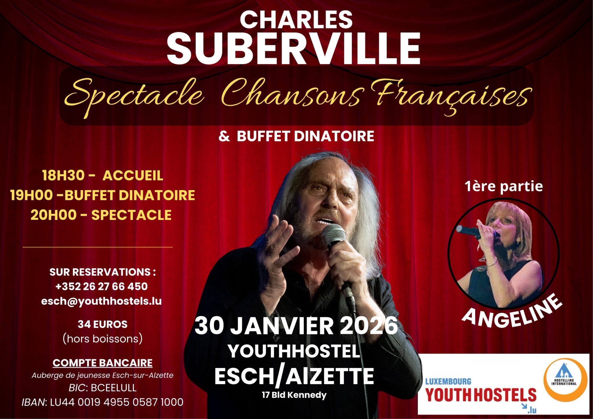 L’Auberge de Jeunesse d’Esch offre un cadre idéal pour les concerts et les spectacles intimistes. Le vendredi 30 janvier, l’Auberge de Jeunesse invite le public à une soirée raffinée de chansons françaises, accompagnée d’un cocktail dînatoire convivial, en compagnie de Charles Suberville. Une occasion où musique, narration et ambiance se mêlent pour une expérience culturelle vraiment mémorable.